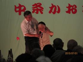 交流会の会場は皆さんの熱気で暑いほどでした。しばらくご歓談頂いた後は「中条かおる一座」