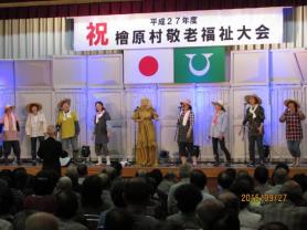 平成27年9月27日(日)檜原村主催の敬老福祉大会に参加しました。この行事は長寿や米寿の方の顕彰を行い、アトラクションで楽しんで頂くもので、檜原村から多くの方が参加され、施設からも毎年参加させて頂いています。