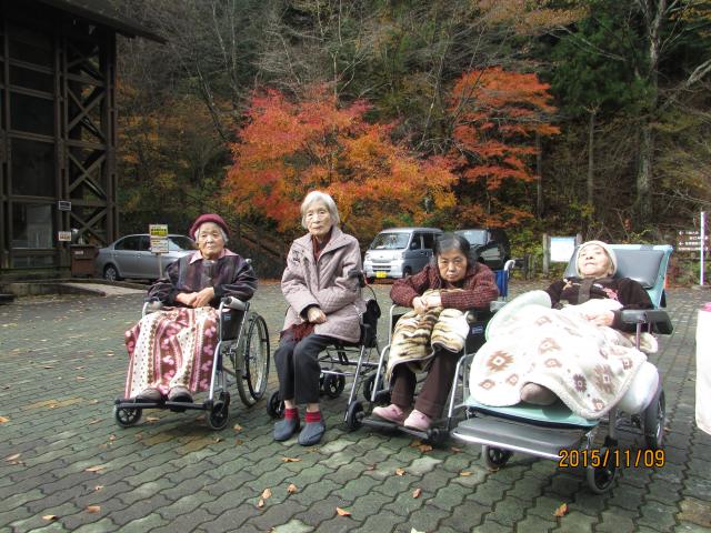 ご利用者が参加され、鮮やかな赤色、黄色に色づいた紅葉を温かいお茶をいただきながら