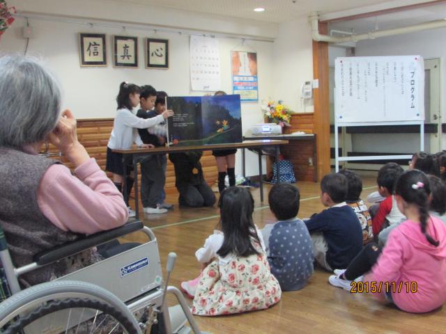 児童の皆さんが入場すると大きな拍手で迎えられ、歌を一緒に歌ったり、大きな本の朗読や