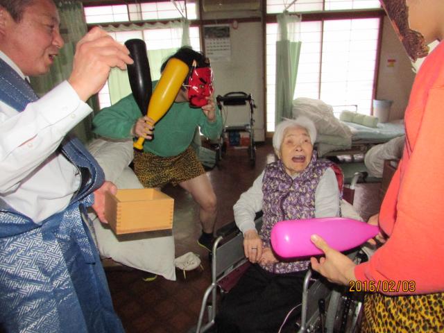 豆をまく、福男、福女は、施設長と今年年女のSケアワーカーが行ない、鬼役は20代