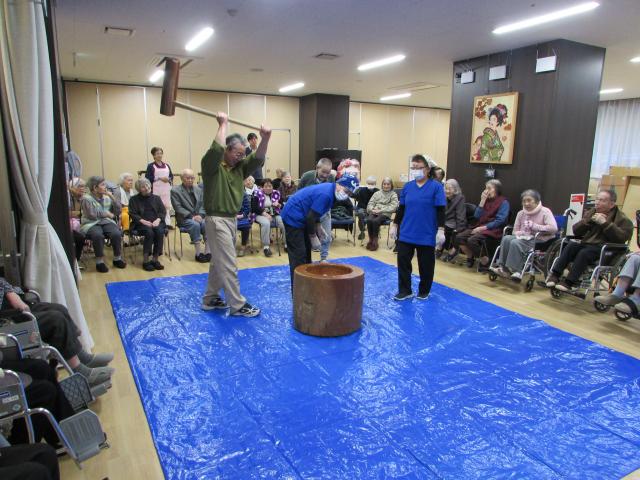 ご利用者様はまだまだ現役!職員に餅つきのいろはを教えていただきました。