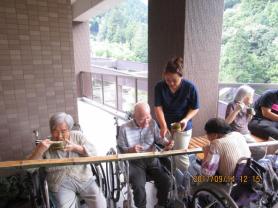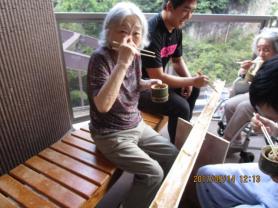いざ、本番!!皆様今か今かと流れてくるそうめんを心待ちにしておられ、流れてくると大喜びで「すくえた!」「すくえないでいっちゃった!」等、大声で笑いながら、楽しまれておられました。場所の関係で、全員一緒にという訳にはいきませんでしたが、交代で全員参加して頂き、夏の風物詩の一つである「流しそうめん」を心から堪能されている様子でした。皆様の笑顔を見て、職員も既に来年の「流しそうめん」の企画を話す等、入居者だけでなく、職員も楽しんだ一日となりました。