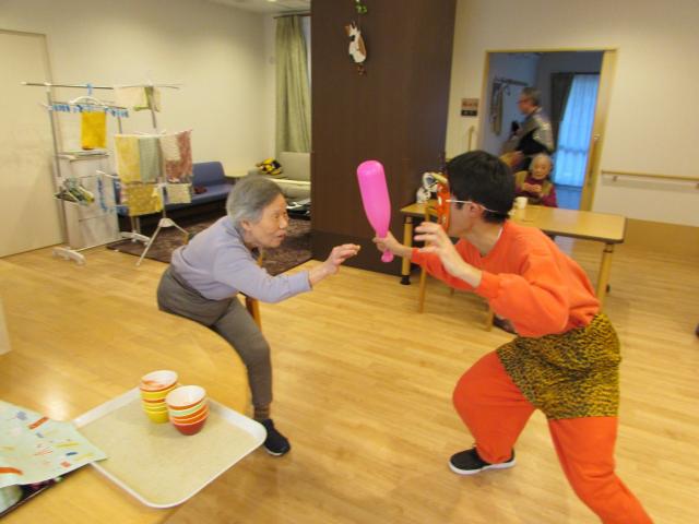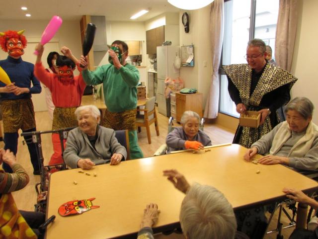 「鬼はー外!福はー内!鬼の目をぶっ潰せー!」と、福男の掛け声が苑内中に響き渡り、鬼たちが入居者様を脅かします。入居者様は鬼に向かって笑顔で手を振り、豆を力いっぱい投げられ、そのお姿はとても勇ましかったです。今年も多くの福が来る、そんな予感がするひと時でした。