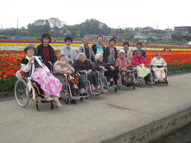 | 4月25日、羽村踊子草公園にチューリップ外出に行ってきました。 当日はご利用者の皆さん、日頃の行ないが良いお陰で絶好の外出日和になり 心もワクワクいざ出発。 檜原ではまだ桜も咲いており桜を見ながらの外出となりました。 今年はチューリップの開花が例年より若干遅かったので当日は満開でした。 赤、黄、白、様々な色のチューリップにご利用者の皆さんも「きれい」と自然と笑みもこぼれ 素晴らしい外出が出来ました。 苑に到着した途端にいきなりの雨。改めてご利用者の皆さんの日頃の行ないの良さに 職員一同、感謝の一日となりました。
