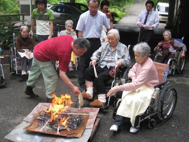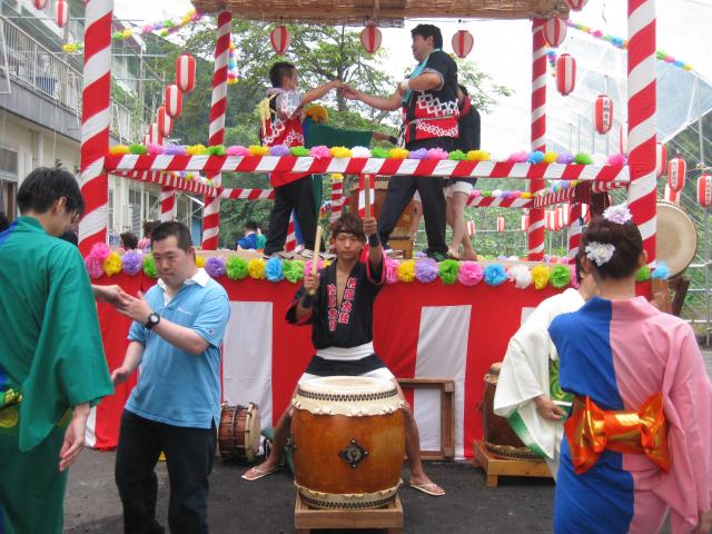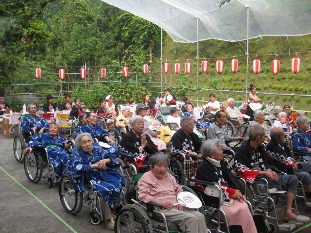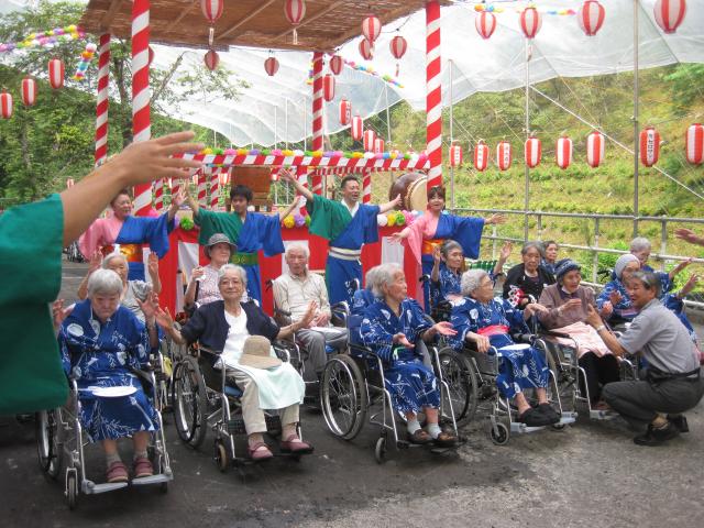 | 第24回桧原苑納涼夏祭り 今年の夏祭りは民謡会踊りや深山会の太鼓など披露して頂き、ご利用者の皆様も 大変喜ばれておりました。ご利用者の皆様は7月より踊りの練習を開始し、 当日はご来賓の方々、家族の皆様に披露しました。 深山会の太鼓は去年より2階ベランダでも太鼓を披露して頂いており、 今年も大変好評でした。 毎年のごとく途中から雨が降ってきてしまいましたが、夏祭り後半には雨も止み 楽しむことが出来ました。 夏祭りの準備にあたり、職員の協力や業者方々、ボランティアの方々に手伝って頂き、 無事に楽しい夏祭りを開催することが出来ました。