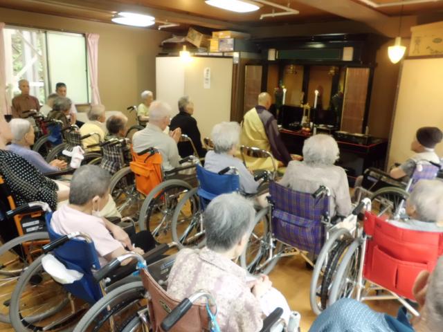 | 9月19日(水)当施設の仏間にて、秋の彼岸供養が営まれました。ご利用者27名と職員が参加し、玉傳寺よりご住職をお招きし読経が行われ、故人のご冥福を祈り追善の法要を行いました。 皆様、仏壇に手をあわせ、ご親族や知人の在りし日の姿を偲んで厳かに執り行われました。その後はささやかながら、茶話会を開きました。最後にご住職と職員で法人墓地にお参りをしました。