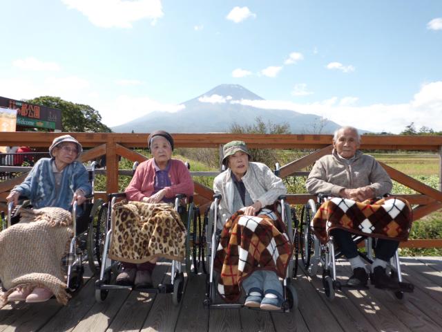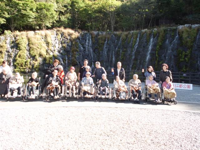 | 10月10日、山中湖近くにある「花の都公園」にご利用者14名、職員14名、総勢28名で出掛けて参りました。例年は昭和記念公園に出向くのですが、今年は少し足を延ばして お花と一緒に普段なかなか目に出来ない富士山も鑑賞して楽しめたらと考え、計画を立てました。 前日までは天気が不安定で当日は雨模様かと心配しましたが快晴となりました。9時過ぎに出発し、上野原を抜け中央高速へ。富士五湖道路を過ぎるあたりから、富士山が目の前に広がり車中は歓声に包まれました。公園に着いてからは、地元の名物「ほうとう、うどん」で昼食。その後はゆっくりと見事なコスモスや雄大な滝などを鑑賞しました。気温が低くなることを懸念していましたが、暖かく、風もなく幸運に恵まれました。 帰りの車中にて体調を崩す方もなく、無事帰苑しました。親切にしていただきました花の都スタッフの皆様とご協力頂いたご家族の皆様、ありがとうございました。