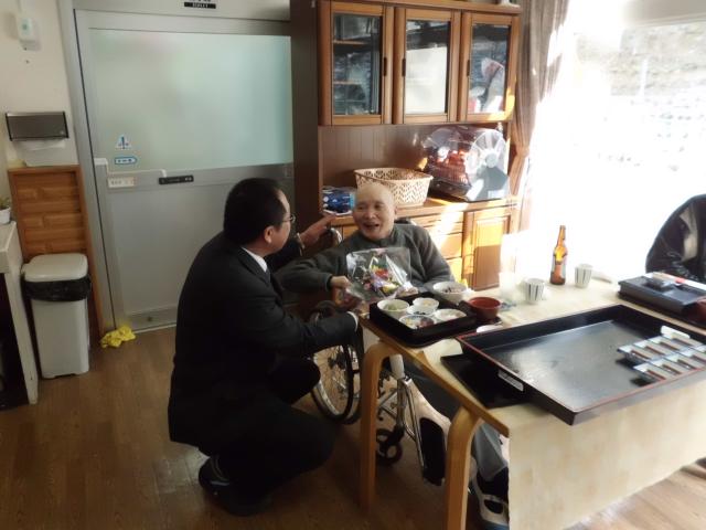 理事長の挨拶、施設の乾杯でおいしいお酒とお祝い膳を召し上がっていただきました。