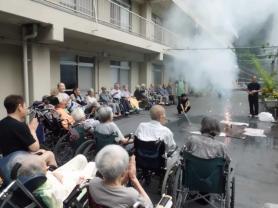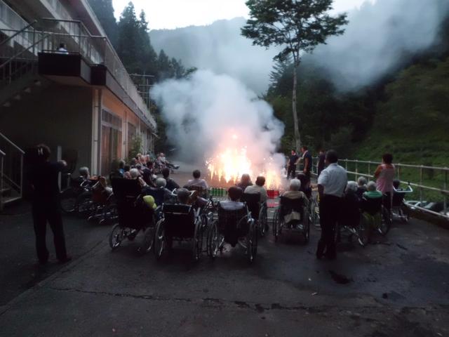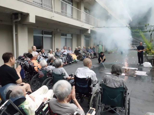 施設長の挨拶を皮切りに、まずは噴射花火を打ち上げました。噴射花火が打ちあがる度に歓声と拍手があがり数百発の噴射を楽しまれ、最後に打ち上げ花火を観賞され迫力ある音と打ち上げにこちらも歓声と拍手が沸き起こりました。