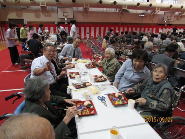平成27年9月27日(日)檜原村主催の敬老福祉大会に参加しました。この行事は長寿や米寿の方の顕彰を行い、アトラクションで楽しんで頂くもので、檜原村から多くの方が参加され、施設からも毎年参加させて頂いています。