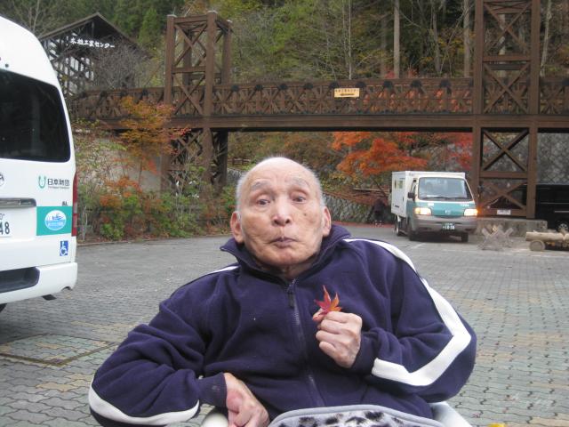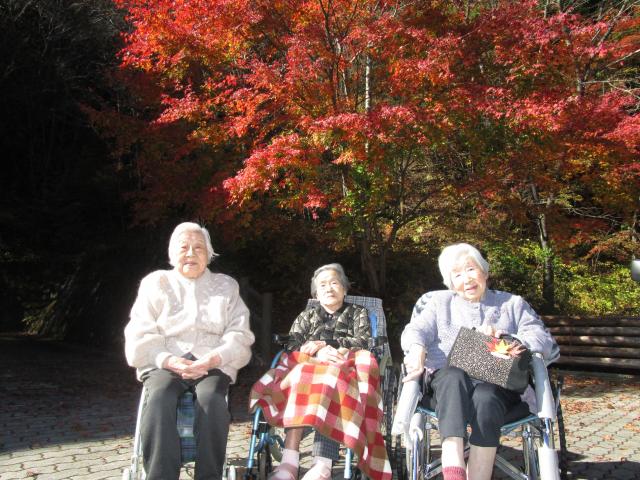ご利用者が参加され、鮮やかな赤色、黄色に色づいた紅葉を温かいお茶をいただきながら