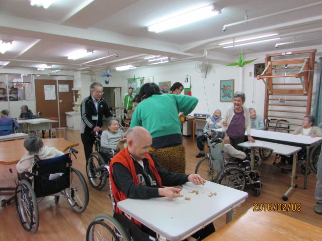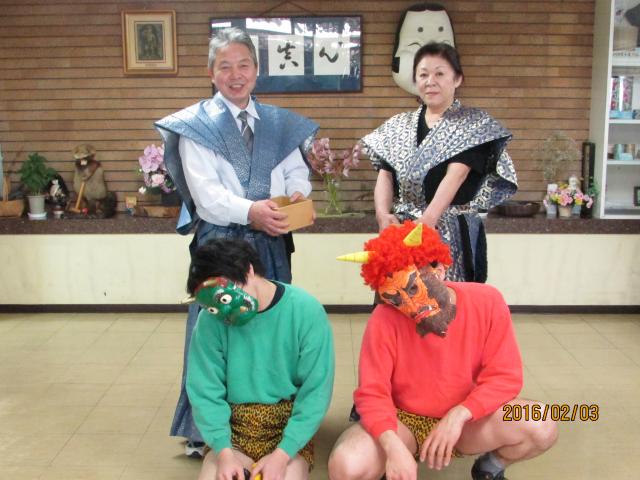 豆をまく、福男、福女は、施設長と今年年女のSケアワーカーが行ない、鬼役は20代