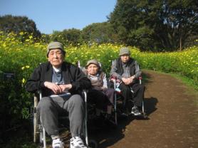 9月末より台風が発生し、10月の出発が心配されましたが、当日は夏日を記録し、とても暑い一日でした。 苑を予定の時刻に出発し、途中車酔いのご利用者も無く現地に到着しました。 公園内ではあまりの暑さに日陰を求めて散策を開始しました。 最初のお花畑が見えてくると皆さん口々に「わぁきれいね」と喜ばれ、そこでコスモスをバックに記念撮影を行いました。 さらにみんなの広場に向け散策を続けていくと、林の向こうに菜の花を思わせるような黄色いコスモスのお花畑が出現、参加者の方々からは「こりゃぁ綺麗だ」「黄色いコスモスってはじめて見たわ」と大変驚かれていました。その後は、「みんなの広場」近くの売店でソフトクリームをいただき、気温が高い日だったので参加者の体調も考慮して、早めに現地を出発し帰路に就きました。 体調を崩される方も無く、皆さん楽しい一日だったと口々に話され、担当者としてとても嬉しく思いました。
