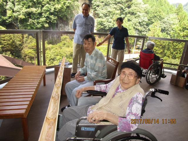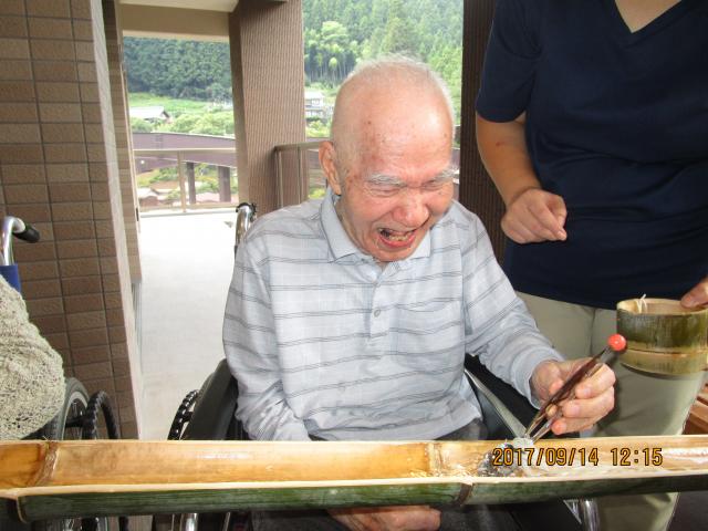 いざ、本番!!皆様今か今かと流れてくるそうめんを心待ちにしておられ、流れてくると大喜びで「すくえた!」「すくえないでいっちゃった!」等、大声で笑いながら、楽しまれておられました。場所の関係で、全員一緒にという訳にはいきませんでしたが、交代で全員参加して頂き、夏の風物詩の一つである「流しそうめん」を心から堪能されている様子でした。皆様の笑顔を見て、職員も既に来年の「流しそうめん」の企画を話す等、入居者だけでなく、職員も楽しんだ一日となりました。