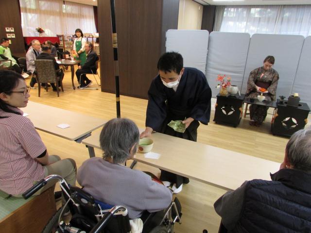 青柳茶道会の方が、目の前でお茶のお点前を披露していただき、その後で和菓子と共に抹茶を