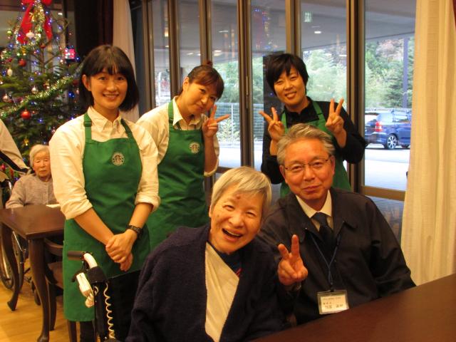 1階の喫茶ルームでは、緑色のエプロンをしたスターバックスコーヒーの方が、入居者とお話しを