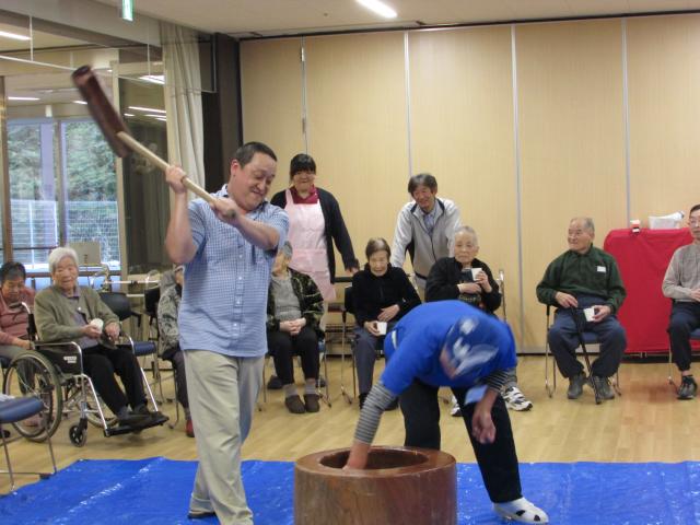杵で餅をつく、つき手にはご利用者様も参加され、大勢の方につき手をお願いしました。