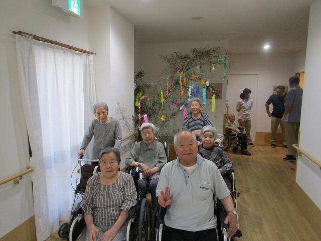 当日は、笹の前で、願いが叶うよう皆さんで記念撮影。当日の昼食は七夕食で、そうめん・七夕ゼリーを美味しそうに召し上がっていました。皆さんの願いが届きますように・・・!