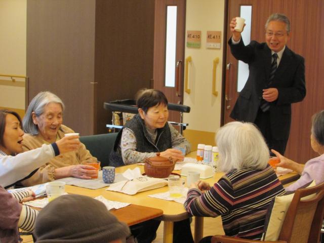 それぞれのユニットを廻り、ご利用者と一緒に開苑記念を祝い、ビールやジュース、お酒