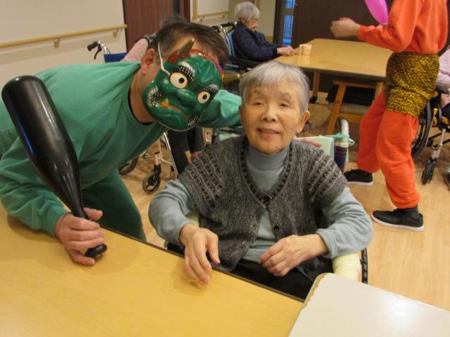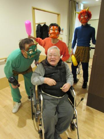 「鬼はー外!福はー内!鬼の目をぶっ潰せー!」と、福男の掛け声が苑内中に響き渡り、鬼たちが入居者様を脅かします。入居者様は鬼に向かって笑顔で手を振り、豆を力いっぱい投げられ、そのお姿はとても勇ましかったです。今年も多くの福が来る、そんな予感がするひと時でした。